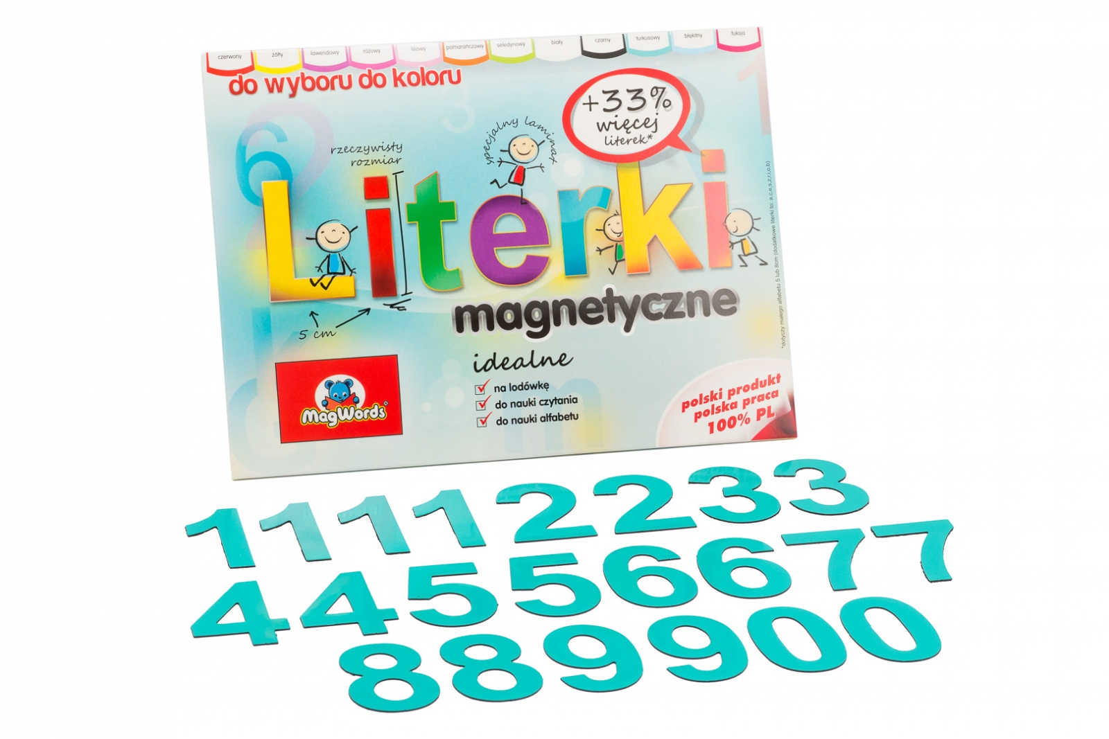 • Komplet 22 turkusowych magnetycznych cyfr: 1, 1, 1, 1, 2, 2, 3, 3, 4, 4, 5, 5, 6, 6, 7, 7, 8, 8, 9, 9, 0, 0,